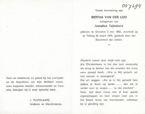BX XX Joseph Maria *14-05-1890 Tilburg +05-03-1971 Oisterwijk, 80 jaar oud, gehuwd met Theresia Catharina Maria Smeulders *10-12-1907 Hilversum +08-02-2001 's-Hertogenbosch, 93 jaar oud.