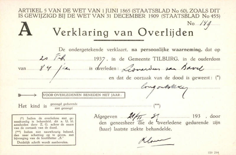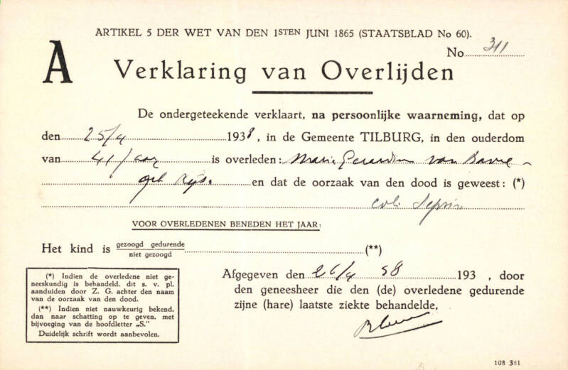 BBBB XXXX Maria Elisabeth van Bavel, *25-01-1887 +23-06-1946, 59 jaar oud, gehuwd op 1 juli 1926 met Petrus Josephus Koolen *10-03-1893 Kaatsheuvel +30-08-1929 's-Hertogenbosch, 36 jaar oud (hij huwde 30-05-1922 Wilhelmina Antonia Henrica Sins *06-10-1891 Loon op Zand +14-08-1924 Loon op Zand, 32 jaar oud) en daarna Maria Elisabeth van Bavel gehuwd op 20 januari 1931 met Wilhelmus Petrus van Gijzel *06-09-1877 Tilburg +28-11-1963 Tilburg, 86 jaar oud. Voor huwelijk met Maria van Bavel een relatie gehad huwelijk op 20-01-1931 Loon op Zand met Henrica Maria van Dijk. *14-12-1880 Tilburg +28-02-1929 Tilburg, 48 jaar oud. (Verdelen van een erfenis, hoe verloopt dit...)