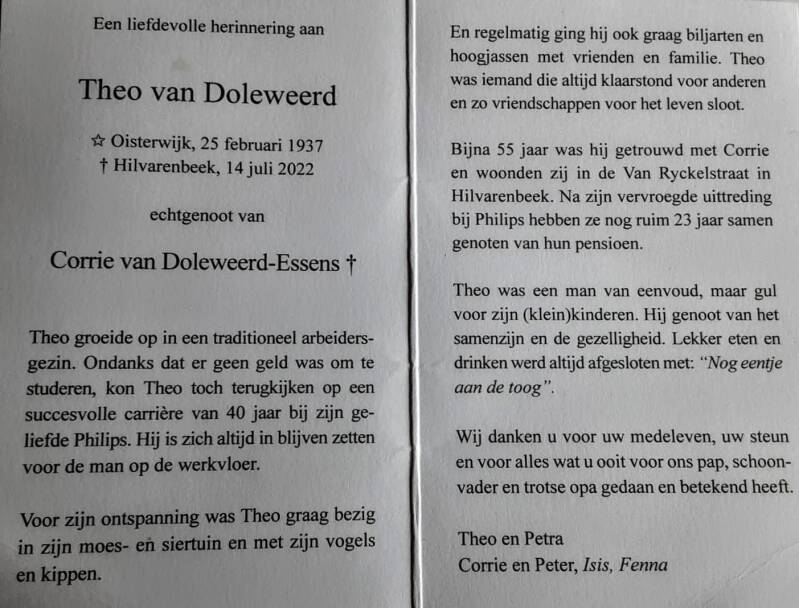 XX XX Petrus Adrianus Josephus *07-05-1929 +22-03-1998, 68 jaar oud, g/m Helena (Leny) Josephina Cornelia van Cuijk *22-03-1928 Tilburg +25-02-1962 Tilburg, 33 jaar oud.