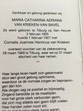 Maria Catharina Adriana *02-02-1905 +28-03-1989 Tilburg, 84 jaar oud gehuwd 01-02-1927 met Cornelis Joannes Henricus Krieken *09-06-1902 +31-10-1993,