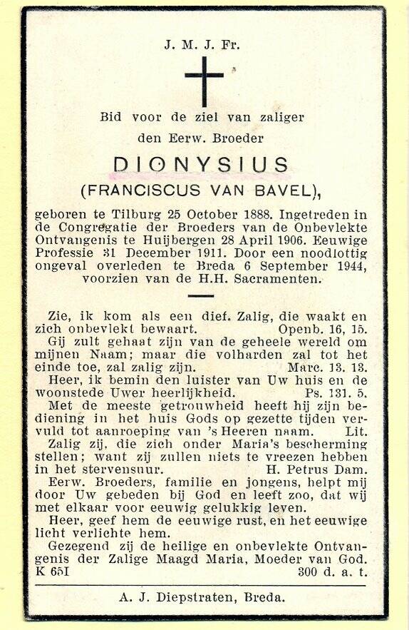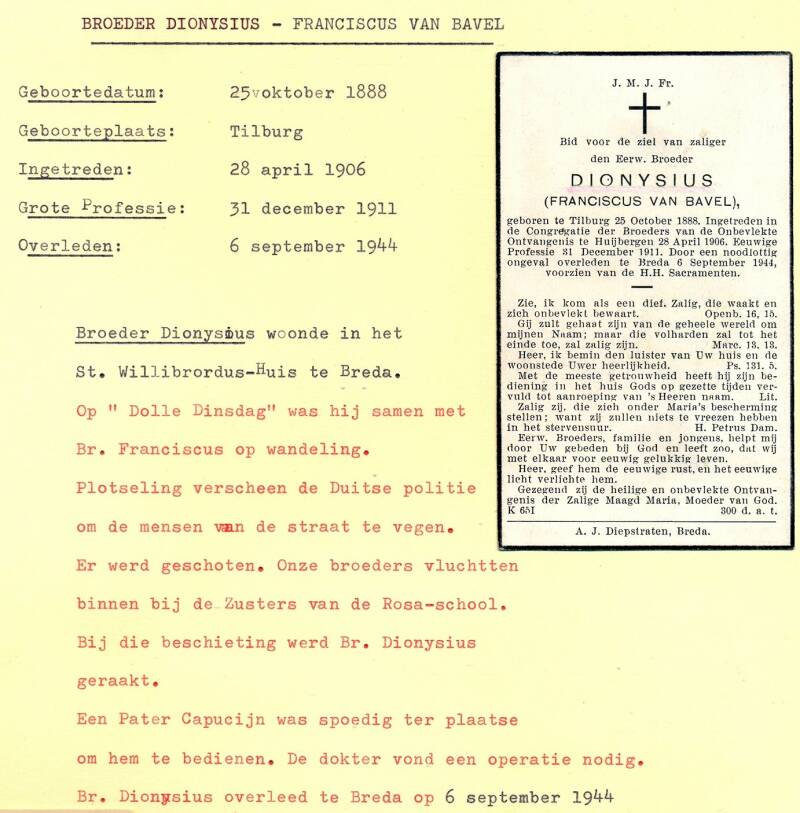 Broeder Dionysius werd op 6 september 1944 – een dag na Dolle Dinsdag, tijdens een wandeling door de Feldgendarmerie doodgeschoten. De sterfakte vermeldt half acht 's ochtends als tijdstip van overlijden, neergeschoten door de Duitsers op 6 september 1944. Hieronder het relaas opgetekend door de broeders van het St. Willibrordus huis.
