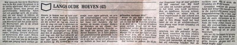 Ik heet naar mijn grootvader, Gradus Gerard Kleinveld uit Hamersveld. Mijn vader, Willem van Weerhorst, is hier 8 december 1868 geboren. Het was voor ons in de familie altijd van jongs af hard werken geblazen, je begon met het licht worden en je hield tegen de donkerte op. Je ging naar de lagere school en als die achter de rug was, moest je aan de slag om wat te verdienen en brood op de plank te helpen. Als ik je vertel dat van mijn schoolklas er krap twee doorgingen met leren, dan ben ik duidelijk genoeg. Ik ben ook nog een tijd boerenknecht geweest. Tegen m'n 65-ste ging ik kalmer aan doen, ruimde geleidelijk de koeien op. Nu hebben we er nog eentje, voor eigen gebruik, en zo'n 160 scharrelkippen voor verkoop van eieren aan de deur. Verder om het huus vier bunders. Bij het mesten en hooien vroeger hielpen de Sminken en wij elkaar. Jan Smink had een merrie, Zwartje, en die heeft ons dertig jaar trouwe dienst bewezen. Ze is kortgeleden als gepensioneerde gestorven, jullie hebben er over geschreven. We zijn hier gebleven en we hebben de boel best draaiende gehouden, niet waar Mijn? Broer en zus kijken elkaar lachend aan. Ze waren met hun zessen en hoe het de anderen verging, is de door nu 70-jarige Gradus gauw verteld. Broer Jan zit honderd meter verder, Wousje woont in Eemnes, Geertje in Achterveld, Mijntje (73) zit hier aan tafel en dan nog broer Arie, die in Den Haag neerstreek. Arie komt geregeld hierheen, moet je 's mee praten.... Dat hebben we gedaan. De 65-jarige Hagenaar riep 42 jaar geleden De Bik vaarwel toe. Hij heeft van alles om handen gehad, overal in het land, was nooit werkloos. Bos- en landbouw, horeca, schoolwerk, hobby's en, aldus Arie, ik bleef ongetrouwd en dat scheelt een hoop zorgen...