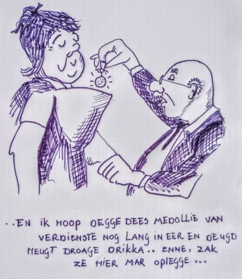 Speciaal voor deze gelegenheid heb ik het boek van mej. R. de Backker van onze Petrus meegekregen. Het is een boek dat nog maar vijftig bladzijden bevat, het is ook nog niet klaar. Het heeft geen speciale omslag, geen sierletters, geen inscripties, maar wel is het een boek met inhoud. Het is een realistisch boek met daarin nuchtere ook wel lachwekkende momenten. Een boek waarin we met regelmaat de boekenlegger moeten benutten. Het is nu tijd, als het even kan, bepaalde momenten te relativeren.