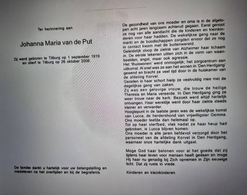 Het was de moeder van Trees en Jo. Dementie overkwam later zowel Trees als Jo. Het bidprentje van Jo, zie hieronder, met momenten in haar laatste levensjaren van waanbeelden, angst maar ook agressie.