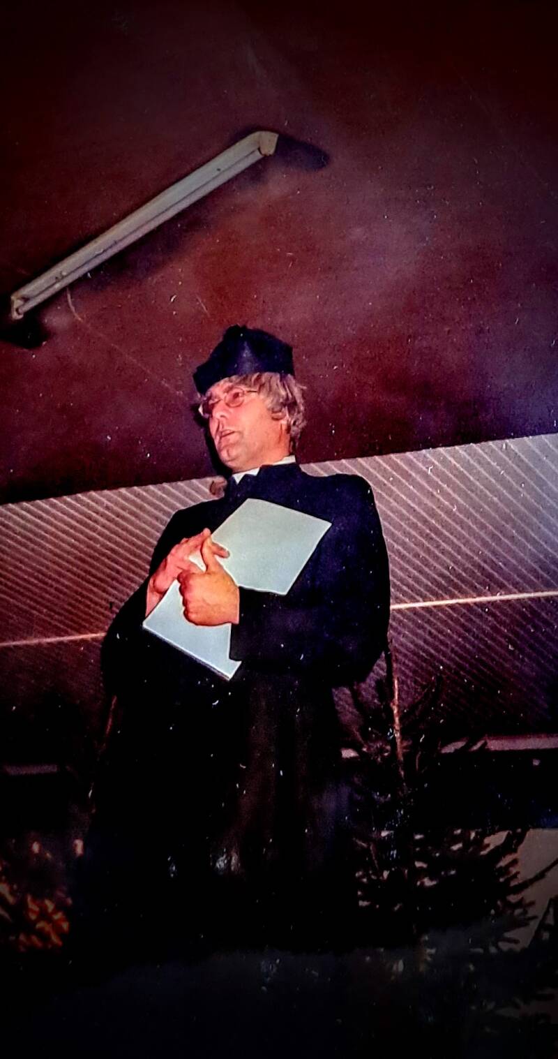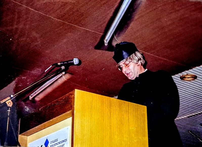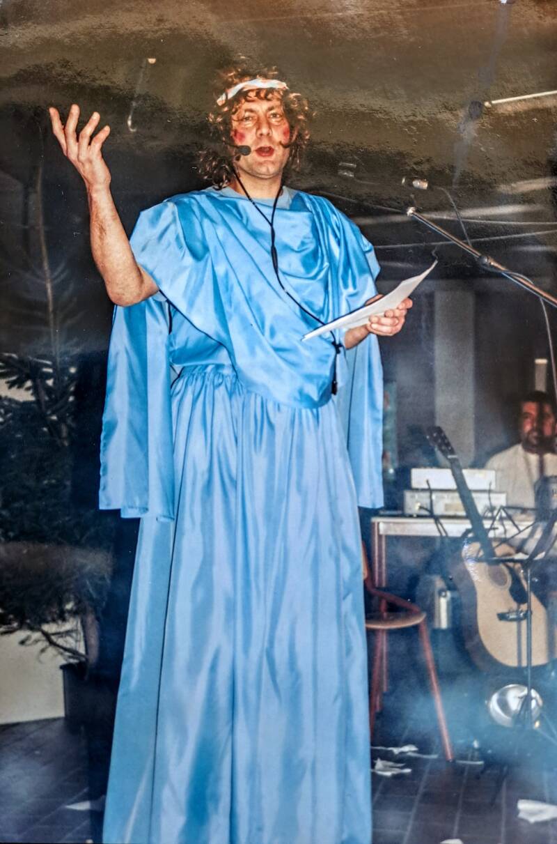 In de sketch waarin ik mij als pastoor Johannes Parnassus (J.P.) den Irste voorstel, doe ik de aankondiging tussenpaus te zijn totdat ROC Midden-Brabant een nieuwe voorzitter definitief heeft gekozen. Het is de tijd van bisschop Ter Schure. Het bisdom heeft zojuist aangekondigd geen dialect te tolereren in de kerk. Het ROC heeft een prijs uitgeschreven voor een nieuwe ROC-naam en er moet een nieuwe voorzitter gekozen worden. Jan Nooijen is op dat moment nog de voorzitter (en ondermeer lid Provinciale Staten namens het CDA) en heel veel vroeger was ie priester. De vrouw van Jan heet Lies. Bart Mutsaers en Peter van Ierland behoren tot de directie van de locatie Techniek. Ada is onze communicatieadviseur. Miel is bestuurssecretaris. Ikzelf was in die tijd hoofd personeelszaken en omdat we i.v.m. boventalligheid personeelsleden wilden laten afvloeien, werden er vaststellingsovereenkomsten (=beëindigingovereenkomst ontslag) opgesteld voor belangstellenden incluis een aanvulling via Pensioendesk geregeld.