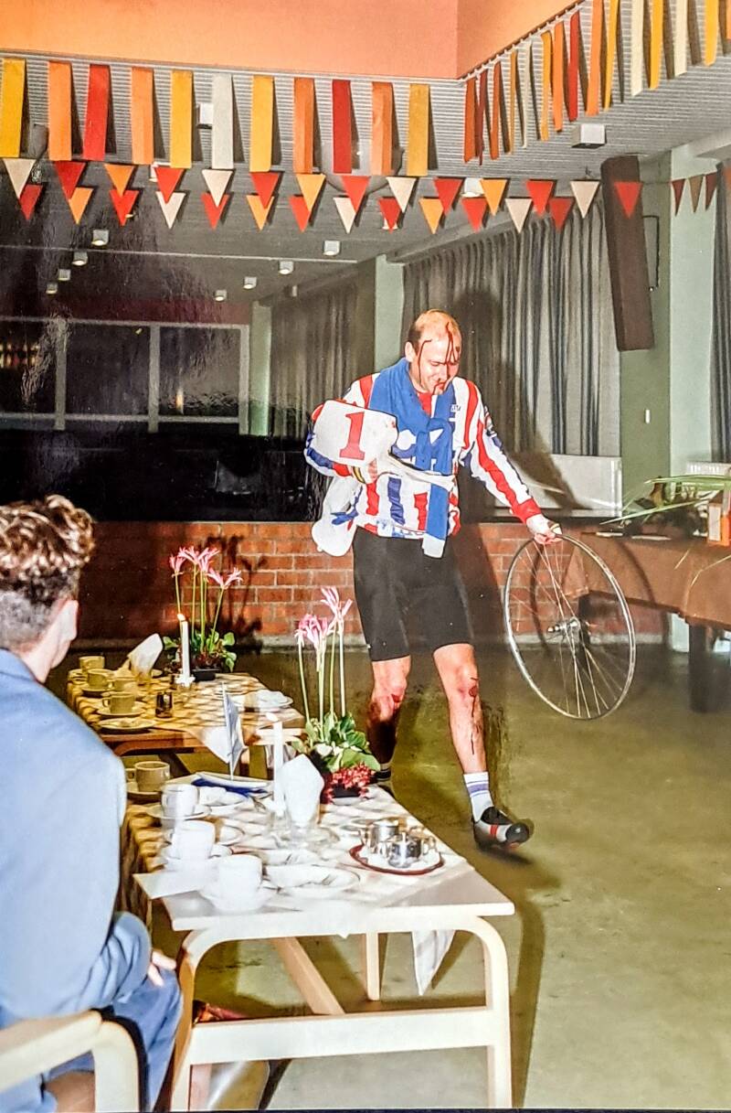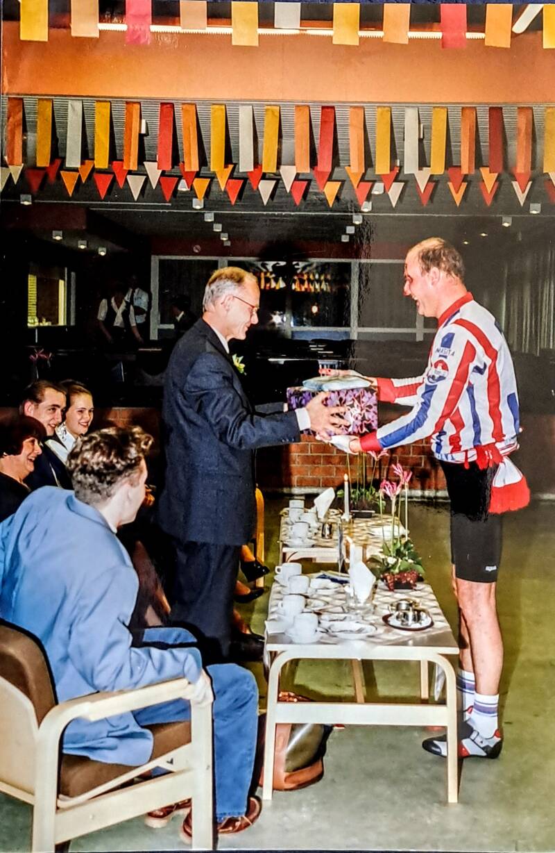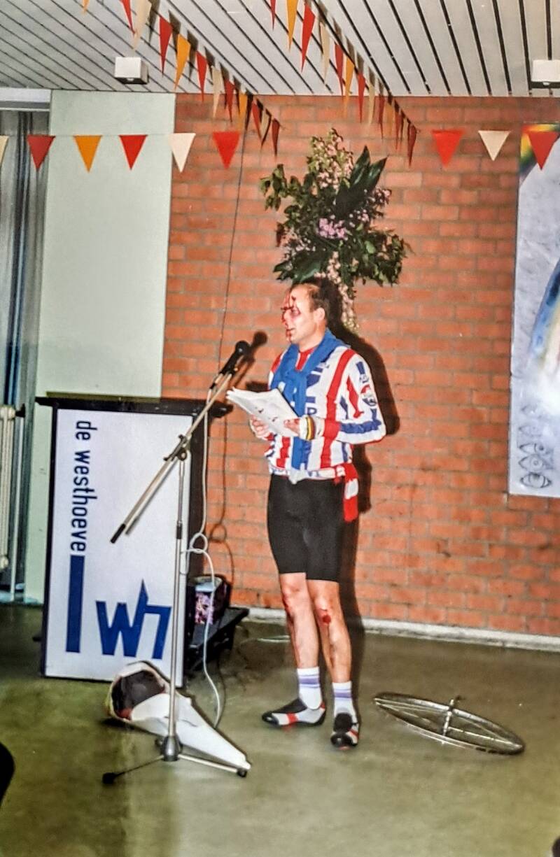 Op vrijdag 8 oktober 1993 werd Jan Huffmeijer in het zonnetje gezet vanwege zijn 25-jarig dienstjubileum. Toen bekleedde hij de functie van directeur Bureau Centrale Diensten. Mij werd gevraagd als voorzitter van de OR om Jan toe te spreken. In afwijking van de rest van de sprekers vertolk ik hierin Jan zelf. In de hoedanigheid van Jan als wielrenner die in de Pierenberg (een prachtig natuurgebied tussen Tilburg en Oisterwijk) een hoofdletsel opliep.