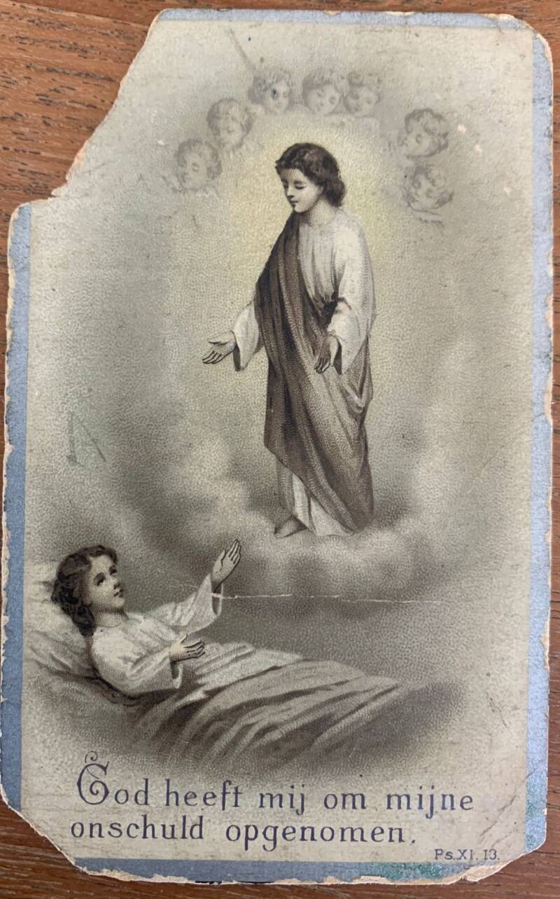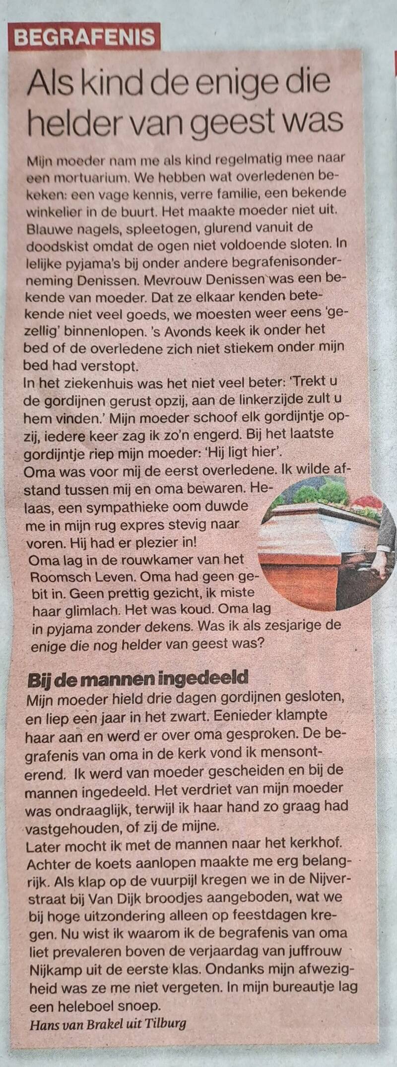 Oma lag in de rouwkamer van het gebouw Roomsch Leven, Tuinstraat 65 in Tilburg. Omdat oma geen gebit in had, trok haar mond naar binnen. Dat vond ik geen prettig gezicht en miste de glimlach van oma. En daarnaast een temperatuur die ondraaglijk was. Oma lag in haar witte pyjama, zonder dekens, in de kist. Was ik nu de enige die nog helder van geest was, met mijn zes jaar?