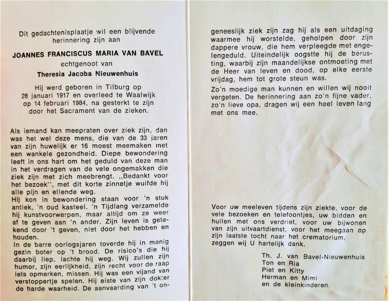Ik heb diverse familieleden bezocht voor de benodigde informatie, en van achterneef Frans van Wuijtswinkel uit Vugt ontving ik de volgende anekdote. Een zoon van Adriana Joanna Elisabeth van Bavel, gehuwd met Franciscus van Wuijtswinkel, Jan geheten, was kapper en had een kapsalon in het centrum van Tilburg. Later werd hij kapper in het Maria ziekenhuis.