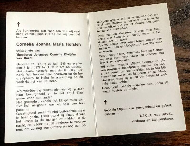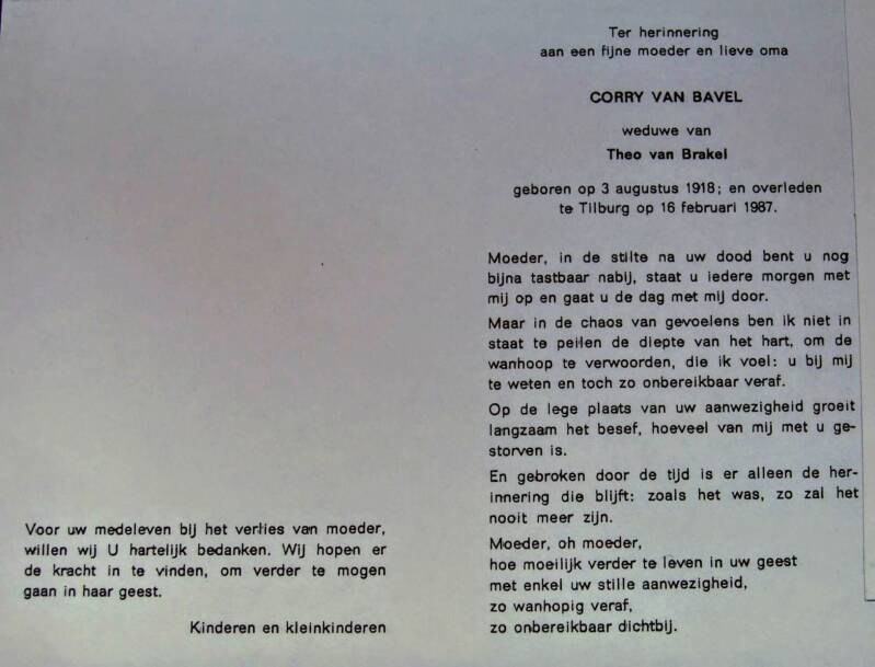 Mijn moeder heeft, conform de traditie van toen, drie dagen de gordijnen gesloten en een jaar in het zwart gelopen. Daardoor werd ze door Jan en alleman aangeklampt en werd er telkens weer over oma gesproken. De begrafenis van oma in de kerk vond ik als 6-jarige mensonterend. Je werd van je moeder gescheiden en bij de mannen ingedeeld, terwijl ik weinig tot niets met mannen had. Het verdriet van mijn moeder was een uur lang ondraaglijk voor me, terwijl ik haar hand zo graag had vastgehouden, of zij de mijne.