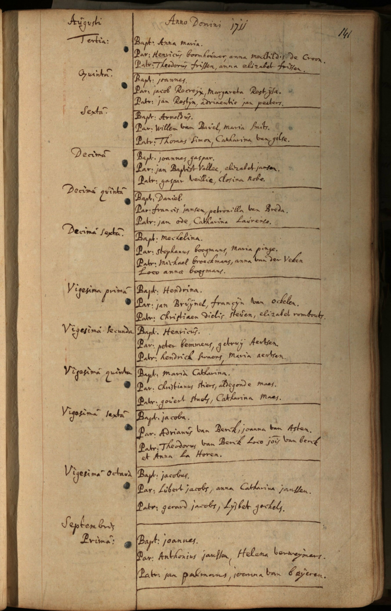 Op dit moment heb ik 15 voorouders gevonden. Tot in 1400, ondanks een brand die in 1534 woedde in Breda en nagenoeg de gehele stad verwoestte. Er is nog voldoende overgebleven voor een grondig genealogisch onderzoek.