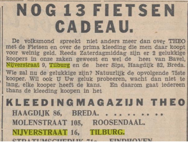 Tenslotte de laatste verhuizing op 16-08-1930 naar de Nijverstraat 7 in de Theresiaparochie. Evenwijdig en ten westen van de Besterdring ligt deze rustige straat die de verbinding vormt tussen de Lange Nieuwstraat en de Veldhovenring. De lichtgebogen straat oogt als een doorsnee 'Tilburgse' straat: niet bijzonder breed en weinig opvallende woonhuizen die bovendien alle modieuze verbouwingstrends uit de voorgaande eeuw laten zien. Het is de Nijverstraat die omstreeks 1900 werd aangelegd. Het gezin Van Bavel woonde in een huurhuis van de St.-Joseph vereniging. De bouwvereniging die deze woningen liet bouwen in de Nijverstraat. De St.-Joseph vereniging was in 1913, als een initiatief van werknemers van de spoorwegwerkplaats, opgericht. Bouwvereniging St.-Joseph gaf in 1920 opdracht tot de bouw van een kleine wijk ten noorden van de Schaepmanstraat. Van deze wijk lag een aantal woningen aan de Nijverstraat.