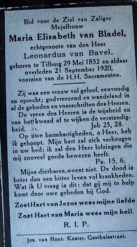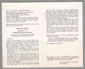 Petrus Maria van Bavel, geboren 22 oktober 1921 en 4 weken later overleden, d.d. 10-12-1921. Bronchitis, ook weer een erfelijke ziekte, die vanuit oma is doorgegeven. Oma is in 1962 aan deze ziekte overleden. Binnen de familie hebben we een flink aantal astmatisch-bronchitis patiënten.
