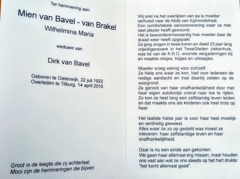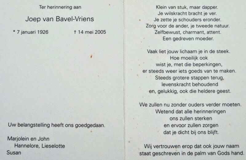 - Joanna (Hanneke) Helena Anna Martina Maria van Bavel *10-08-1950 +28-07-2023