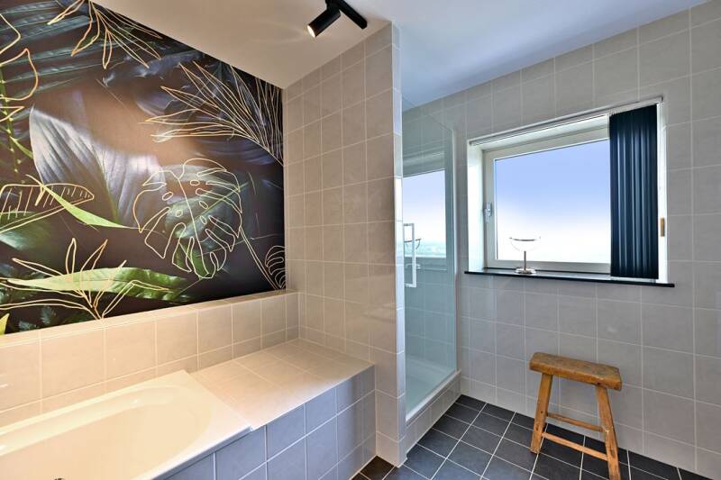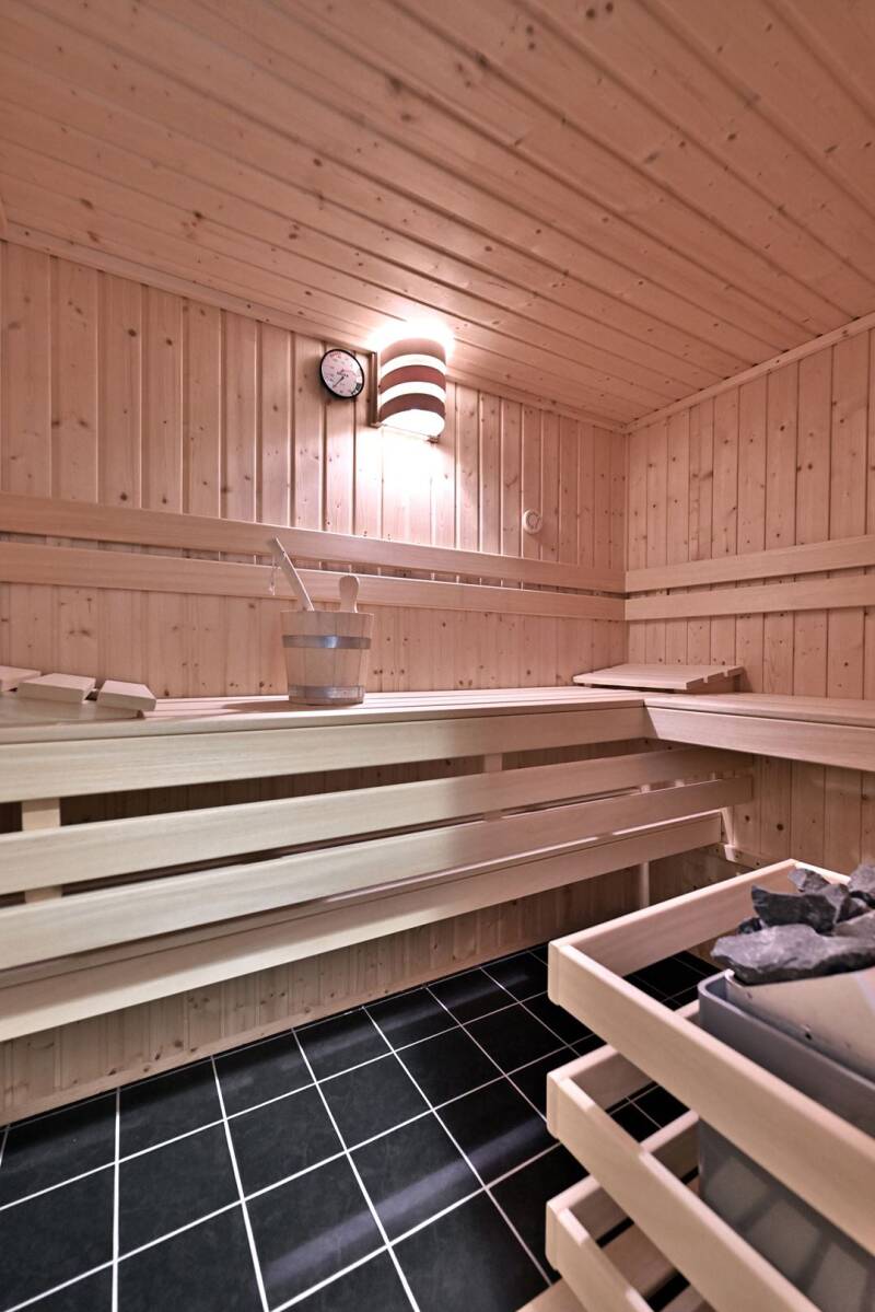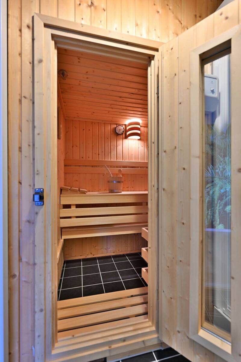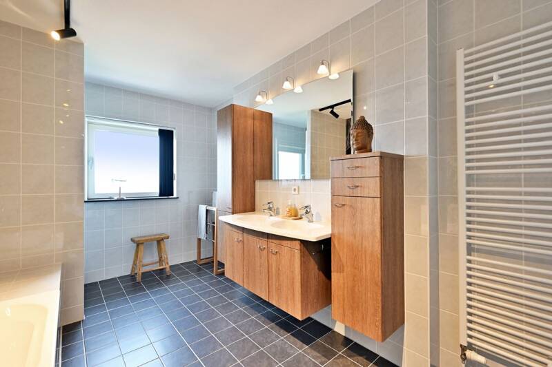 Badkamervoorzieningen Sauna, 2 douches, 2 dubbele wastafels, ligbad, wastafelmeubel, stoomcabine, en wastafel