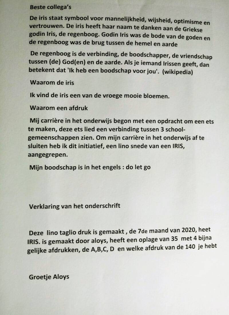 Kunstenaar Aloys Staps, uit de familietak Martina, Josephina van Bavel, 31-03-1890. Bij zijn afscheid kregen de collega's onderstaande lino taglio druk aangeboden. Hieronder afdruk 84 van de 140 in de serie D (A,B,C,D). Oplage van 35 met bijna 4 gelijke afdrukken.