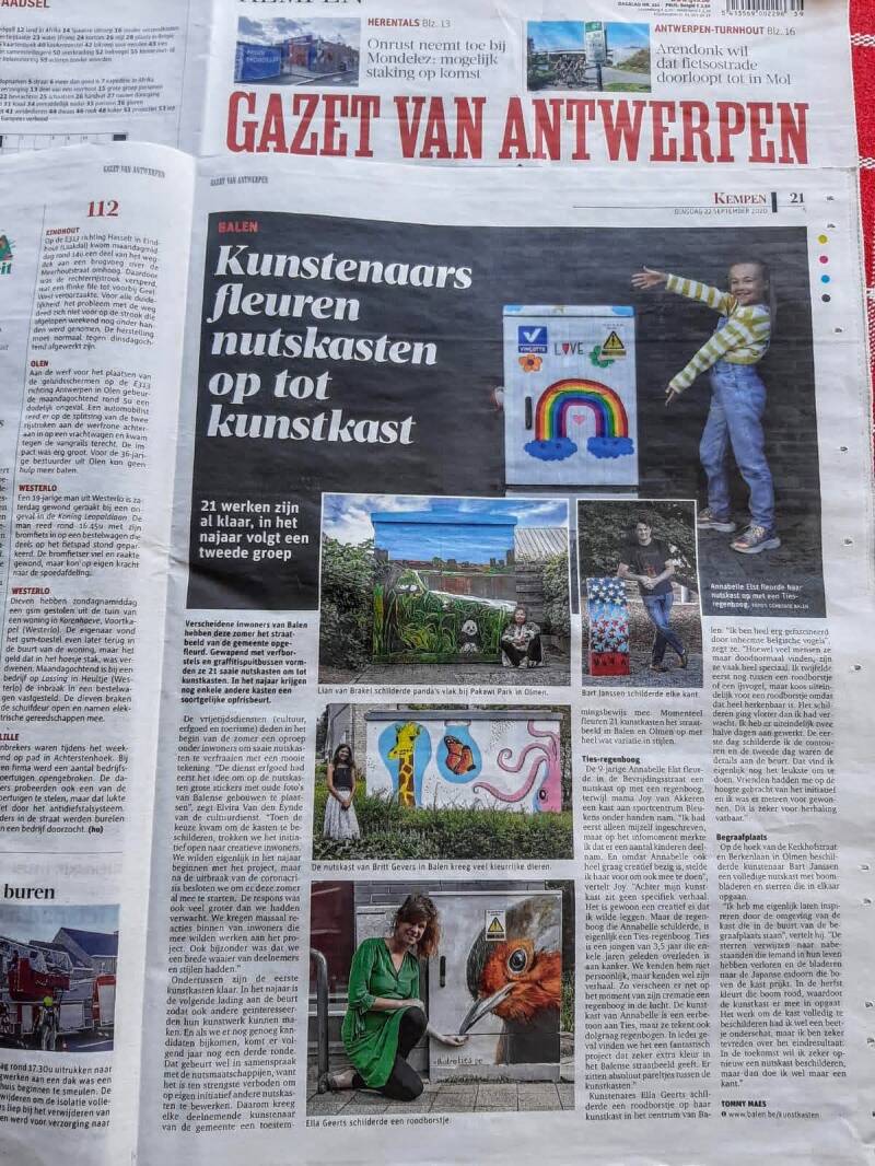 Opnieuw melding van de activiteiten van Lian van Brakel (Atelier Lian), waarmee ze krant en televisie haalde. Hieronder een artikel uit de Gazet van Antwerpen. Een nutskast in Olmen heeft door Lian kleur gekregen.