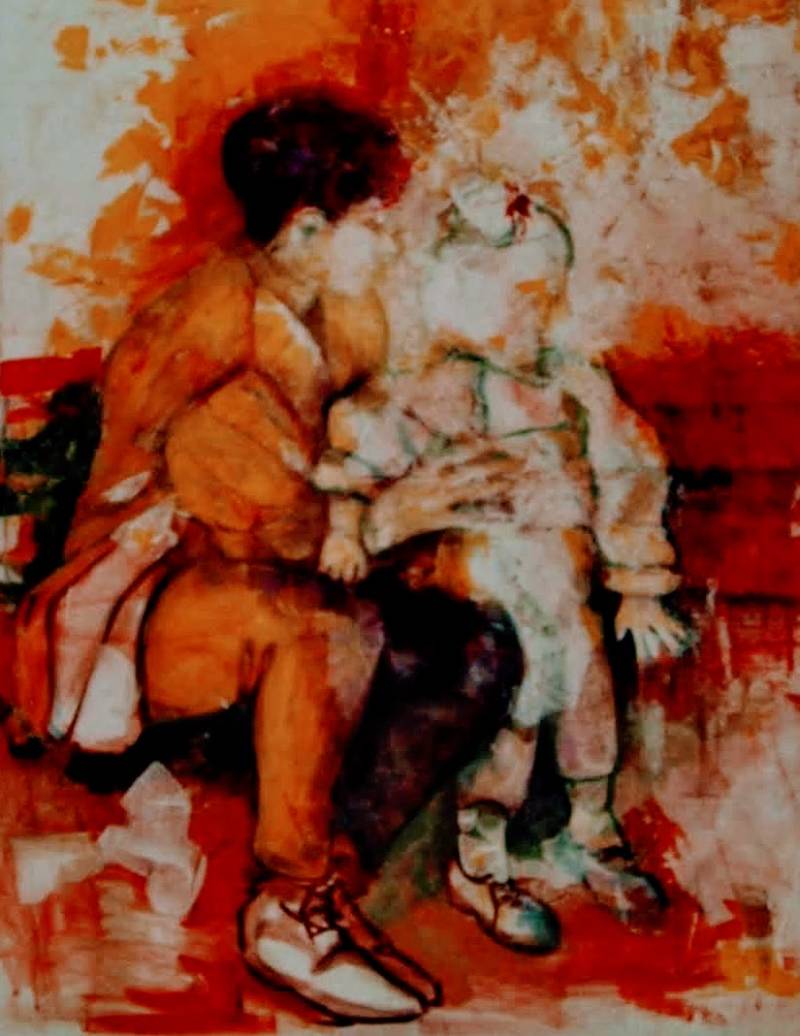 Guido besteedde ongeveer een half jaar aan het schilderij het 'buigend kind' wat deel uitmaakte van een serie van 5 schilderijen, als afstudeerproject. Eerst maakte hij een fotoreeks met het onderwerp 'moeder en kind grijpen (ergens naar)'. Omdat kinderen moeilijk als stil-staand model te gebruiken zijn, zijn foto's een goed uitgangspunt. Uit de foto's zocht hij vijf geschikte onderwerpen. Daarna werd het schilderij in houtskool op het doek gezet en met een kwast grofweg geschilderd; alleen de broodnodige lijnen werden aangegeven. Dan begon het grote weglaat-werk. Met een plamuurmes en acrylverf maakte hij een schilderij waar je nog wel iets van de vormen kunt herkennen, maar dat vooral een sfeer wil aangeven. Daar is de kunstenaar dan ook goed in geslaagd. De schilderijen van Guido geven een goede indruk van de ontwikkeling, die de schilder doormaakte in het abstraheren, plamuren en texen.