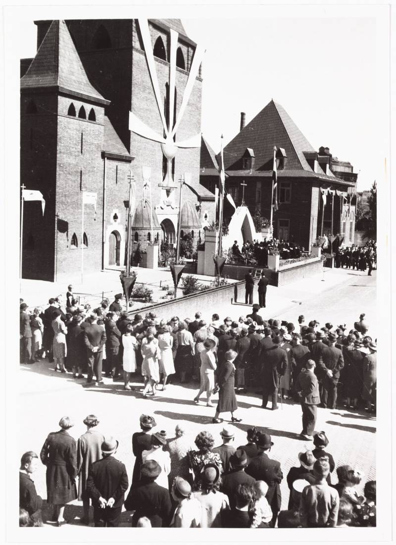 Op 13 augustus 1938 vierde N.V. P. Mercx's ijzer en Staalhandel in de Nieuwlandstraat het 100-jarig bestaan. Links de heer Simons sr. neemt met zijn zonen felicitaties in ontvangst.