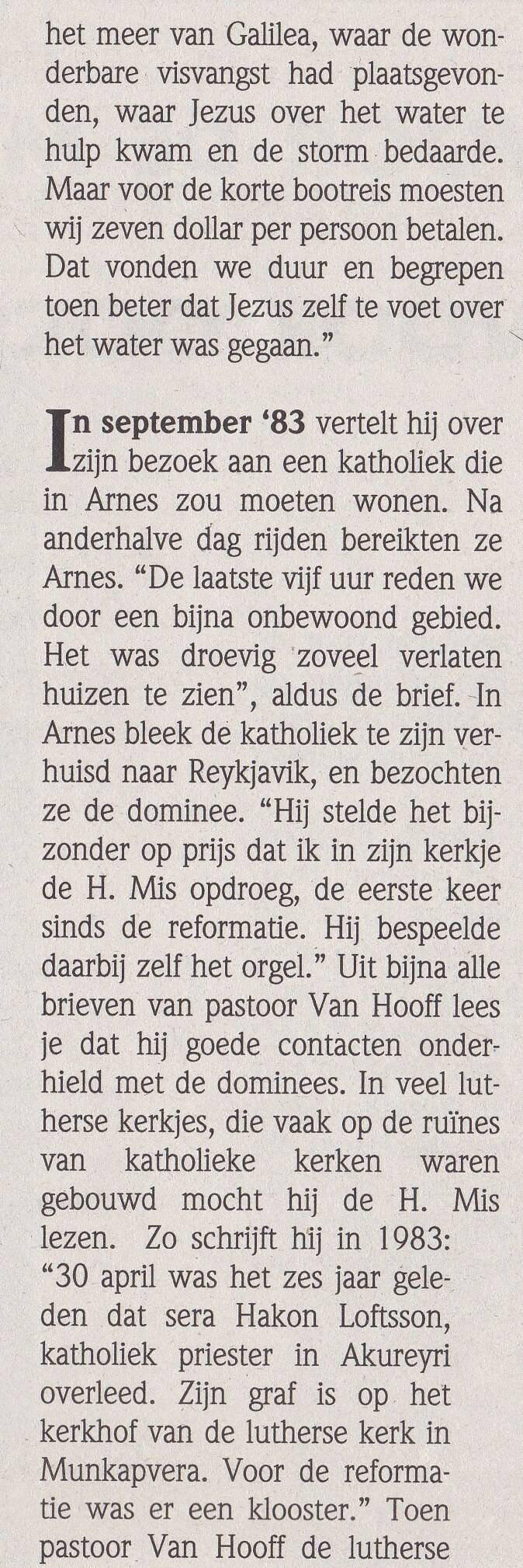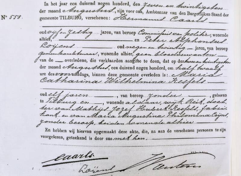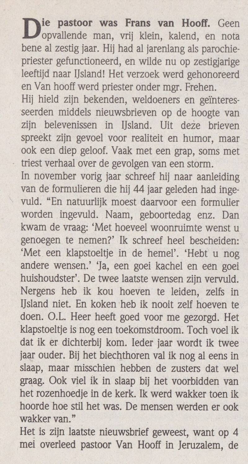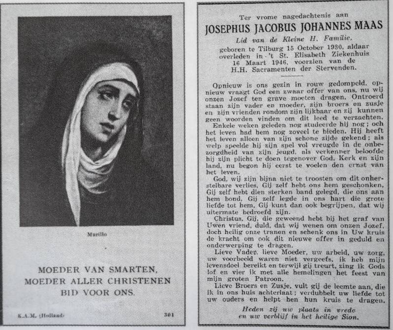 Vier jaar na overlijden van vader bleek dat mijn moeder een hersentumor had. Ze is in comateuze toestand gestorven. Voordat mijn moeder stierf, zijn mijn broer en ik samen met moeder naar het ziekenhuis gegaan. Voor de uitslag van de onderzoeken. Door de tumor werden de momenten dat mijn moeder helder kon denken steeds minder. Op het moment dat we aanschoven bij haar specialist en zijn assistente, kon mijn moeder het gesprek echter weer feilloos volgen. De specialist stelde haar enkele vragen waaronder wie de huidige bisschop is (Ter Schure). Mijn moeder kon het antwoord hierop niet meer zo snel voor de geest halen. Toen de dokter het had over bisschop Mutsaerts, oud-pastoor van haar parochie Theresia, stak mijn moeder van wal.