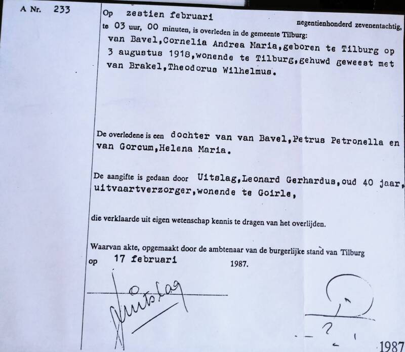 De dokter zei dat moeder nog maar kort te leven had. Enkele maanden! Het was toen eind januari 1987. De tumor vormde een ster en was daarom niet operabel. Dit vond mijn moeder verschrikkelijk, ze wilde van de zomer nog een keer met haar jongste broer op vakantie. Twee weken later, op maandag 16 februari 1987, overleed mijn moeder.
