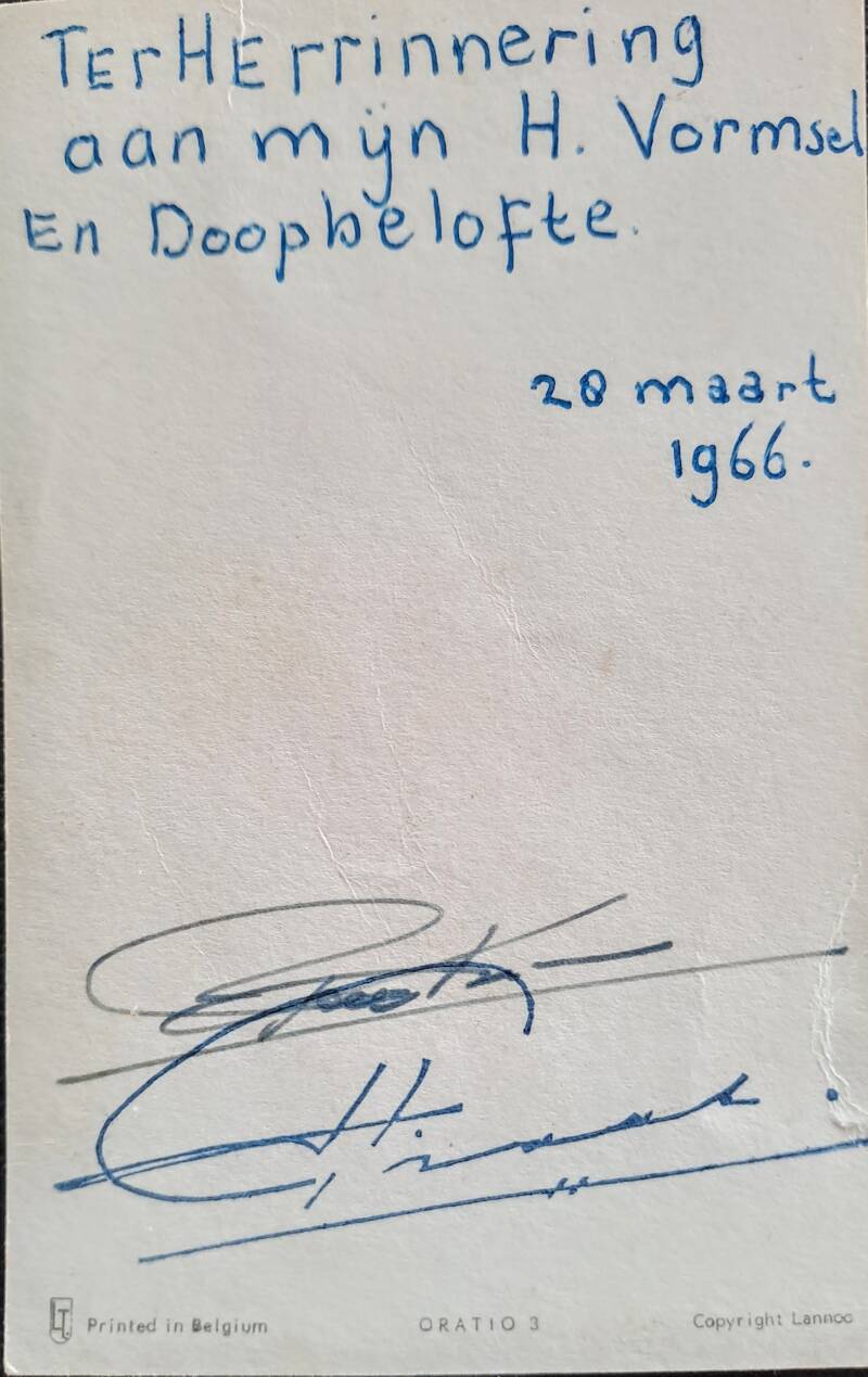 Om het geheel niet al te serieus te nemen heb ik het prentje met een dikke taalfout afgeleverd. Het ontsloeg pastoor François en schoolhoofd Harrie Graat er niet van om hun handtekening op het prentje te plaatsen. Dat in die tijd tijd 'kerk en geloof' een bloedserieuze zaak betrof, bewijst de felicitatie van familie Jooren uit ons hofje. En vooral de betiteling met 'Uw', voor een tienjarige snotneus.