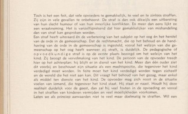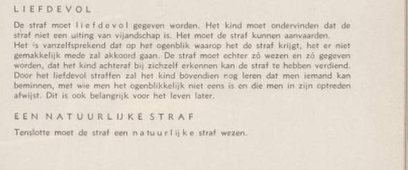 In mijn klas werden leerlingen te pas en te onpas gestraft, of een klap in het gezicht of het was nablijven en strafregels schrijven. Voor in de klas langdurig op de knieën zitten met het gezicht naar het schoolbord. Met een grote liniaal werd op de lessenaar geslagen om duidelijk te maken wie het in de klas voor het zeggen had. In de les ging de deur van het klaslokaal tijdens de les altijd dicht en dan had de leerkracht het alleenrecht. Het recht van de vier muren waar zelfs het hoofd van de school niet tussen kwam. Ook gebeurde het dat de hand met de onderkant naar boven, de handpalm, van een leerling uitgestoken moest worden, zodat de leerkracht een flinke mep met een liniaal daarop kon geven. Met de vlakke hand werd in het gezicht geslagen. Mij staat nog bij dat Ad van Beers uit de Arke Noëstraat, een medeleerling die naast mij in het bankje zat, dit onderging en vervolgens met een knalrode wang stoïcijns bleef onder dit gebeuren. Ikzelf was behoorlijk onder de indruk. We hielden ons echter stoer en ondergingen deze tirannie met gelatenheid.