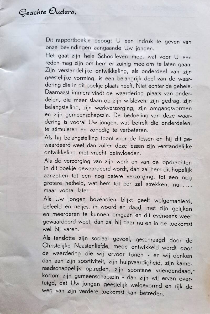 In mijn rapport staat het volgende opgenomen, gericht aan de ouders: "Als Uw jongen blijk geeft welgemanierd, beleefd en netjes, in woord en daad, met zijn gelijken en meerderen te kunnen omgaan en dit eveneens weer gewaardeerd weet, dan zal hij daar nu en in de toekomst wel bij varen."